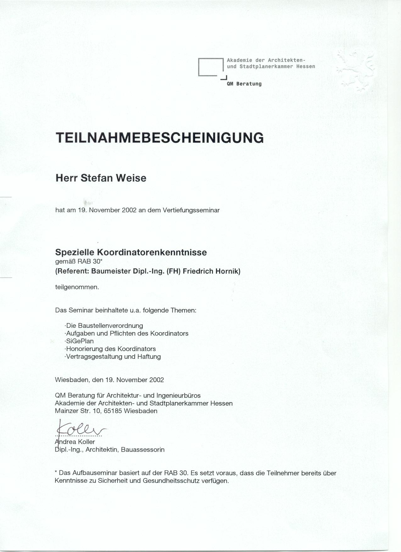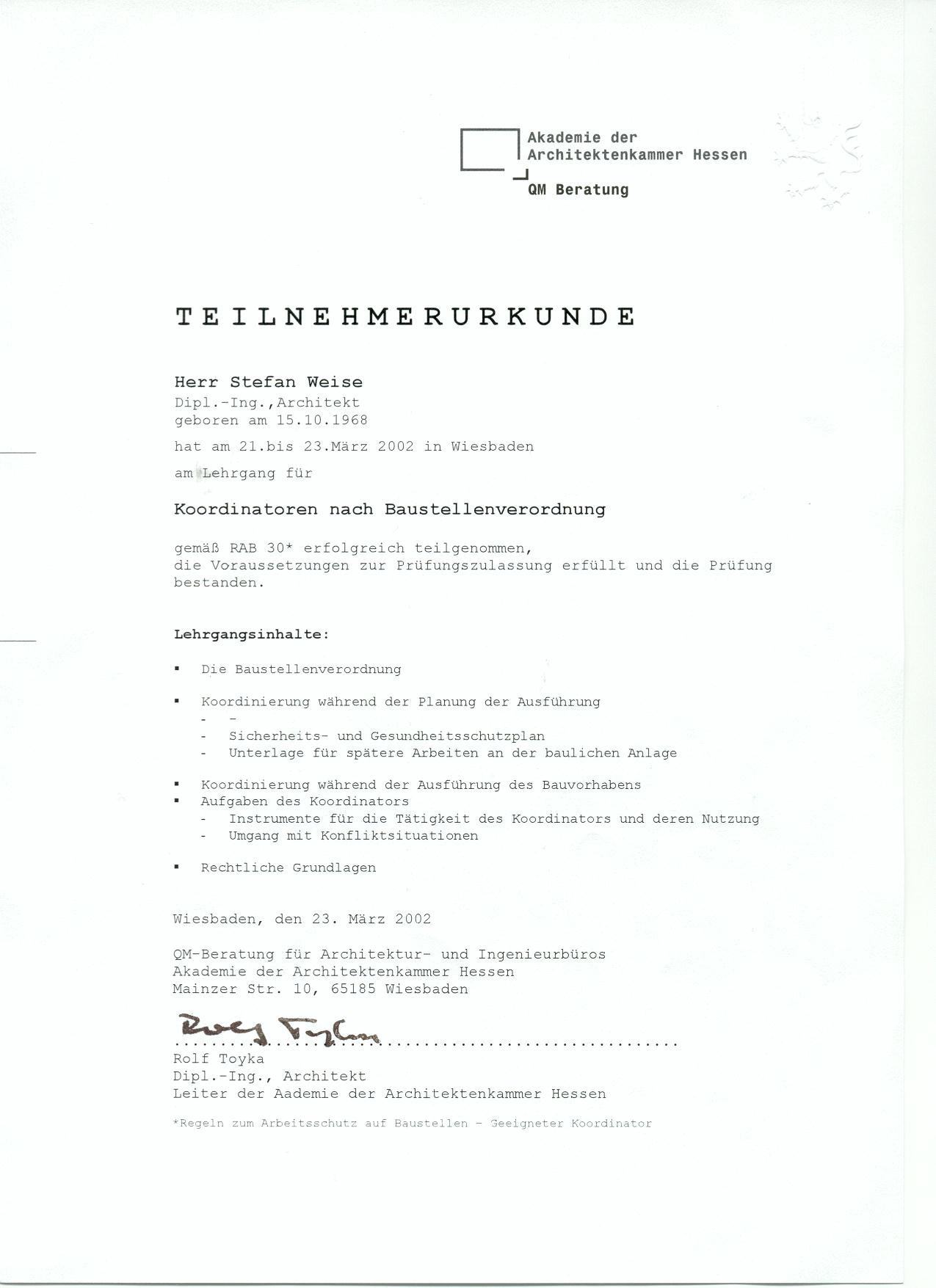 Seit dem 1. August 2002 sind die Mitglieder der Architekten- und Stadtplanerkammer Hessen verpflichtet jährlich an Fortbildungsmaßnahmen teilzunehmen. Hierdurch soll eine Qualitätssicherung für den Bauherrn erreicht werden. Fort- und Weiterbildungsmaßnahmen waren und sind für uns die Basis für erfolgreiche und kompetente Arbeit zum Wohl des Kunden.